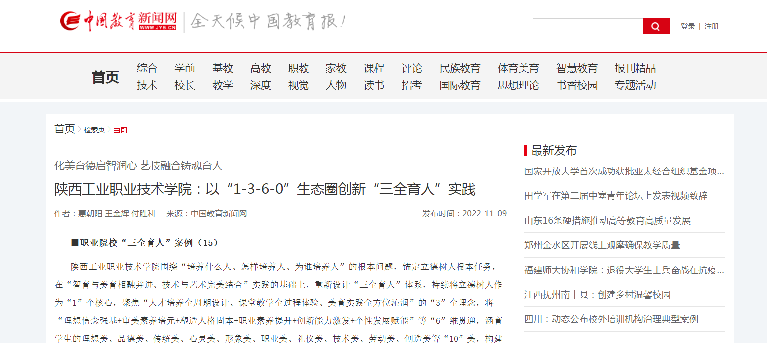 近日,中国教育新闻网精选出24所职业院校“三全育人”典型案例面向全国宣传推广,mg4355官网《陕西工业职业学院:以“1-3-6-0”生态圈创新“三全育人”实践》成功入选。