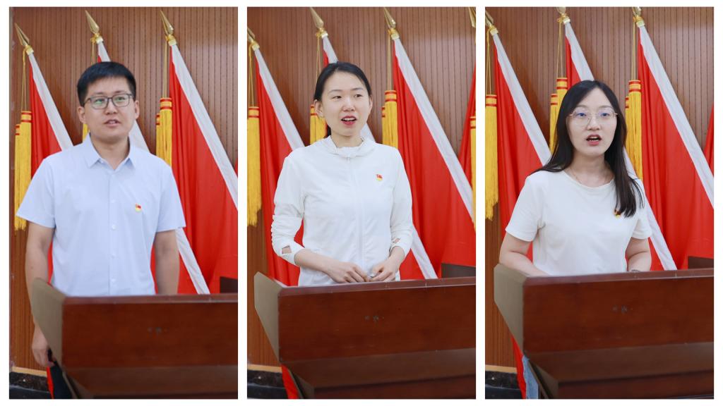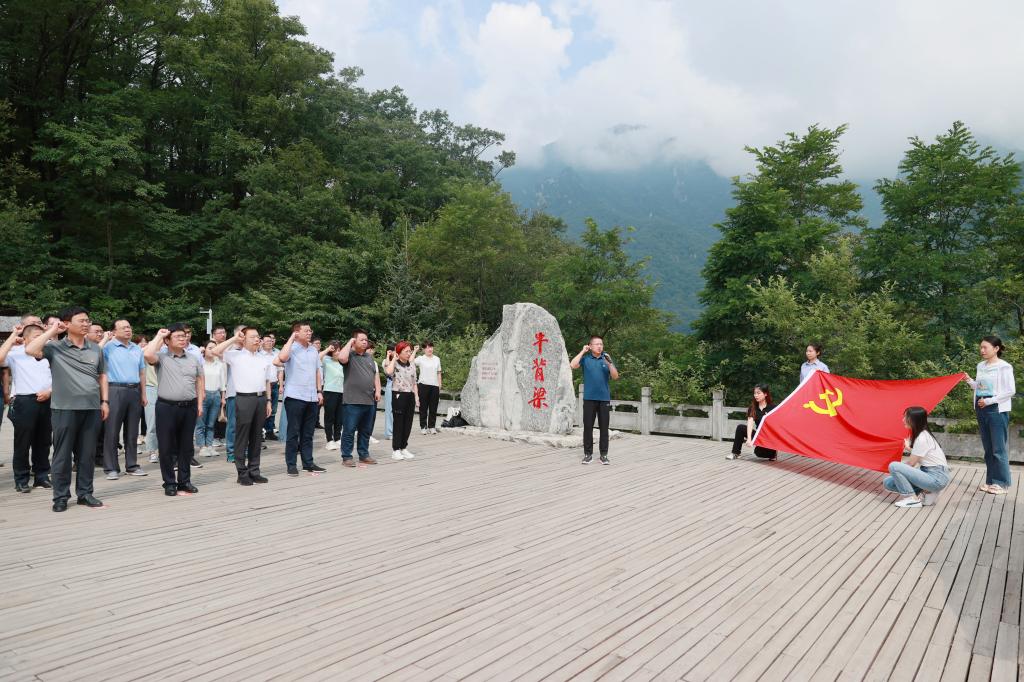 在月亮垭观景台现场教学点,全体人员面向党旗,庄严宣誓,重温入党誓词。
