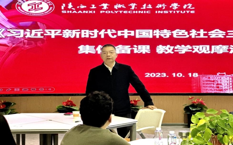 为进一步推动思政课教学,落实《中共陕西省委教育工委办公室陕西省教育厅办公室转发中共中央宣传部办公厅教育部办公厅关于做好〈习近平新时代中国特色社会主义思想概论〉教材使用工作的通知》的精神,10月18日下午,马克思主义学院举办《习近平新时代中国特色社会主义思想概论》课程集体备课教学观摩活动,马克思主义学院老中青三代思政课教师集体备课、教学观摩,党委书记惠朝阳、副校长梅创社出席了本次活动。活动由马克思主义学院院长舒蕾主持。