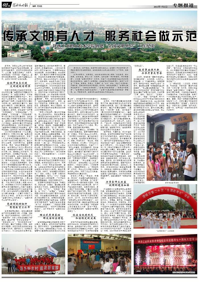 7月2日,由中国文明办指导的全国唯一的《精神文明报》在第2版以《传承文明育人才 服务社会做示范》为题目,从“全校师生齐创建,文明建设结硕果”、“党旗领航树标杆,思想教育上水平”、“理论武装强基础,群众活动出特色”、“依法治校建规范,和谐稳定促发展”、“办学条件大改善,校园环境美如画”、“教育事业俱日新,办学质量受赞赏”等六个方面报道了我院创建“全国文明单位”的工作,在文明创建领域收到了良好的宣传效果。