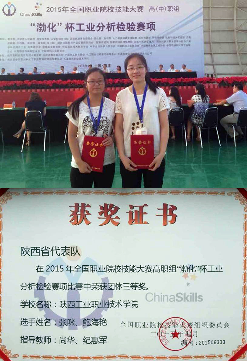7月3日,2015年全国职业院校技能大赛“渤化”杯工业分析检验赛项中高职组比赛在天津落幕。经过三天的激烈比拼,我院化工与纺织学院代表队在领队姚海伟,指导教师尚华、纪惠军和李婧和参赛的工检1301班张咪、鲍海艳同学的共同努力下,荣获团体三等奖,张咪、鲍海燕两位同学还取得国家级“化学检验工”高级工资格。