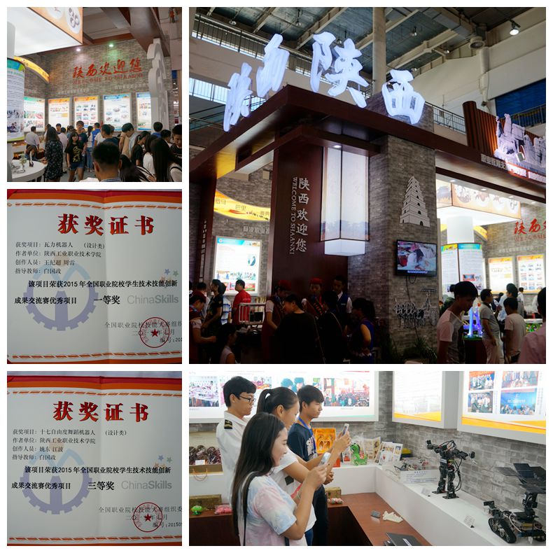 7月2日至4日,2015年全国职业院校学生技术技能创新成果交流赛在天津国际经济贸易展览中心举行,我院5件学生技能作品参展并受到现场裁判专家和参展民众的一致好评。其中由白国政老师指导制作的“十七自由度舞蹈机器人”和“瓦力机器人”分别获得设计类一等奖和三等奖。