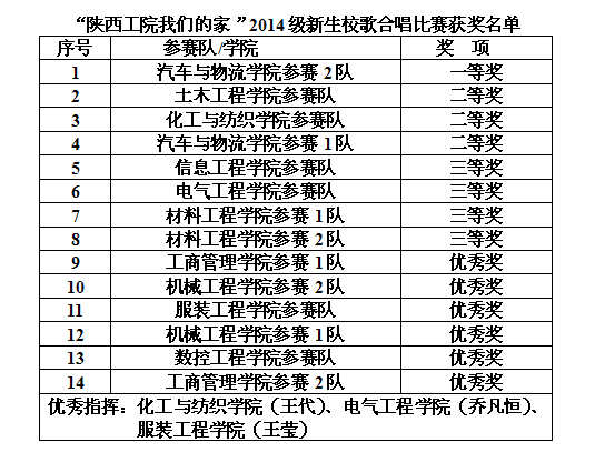 11月12日下午,2014级新生校歌合唱比赛在明德堂礼堂举行。本次比赛由学生工作部、学生处举办,主题为“陕西工院我们的家”,指定曲目为《mg4355vip检测中心校歌》,可采取朗诵、领唱等多种表现形式,为庆祝我院建校64周年,同时也是新生入学教育的重要环节,旨在通过比赛提升精气神,凝聚爱国、爱校热情,增强集体荣誉感。