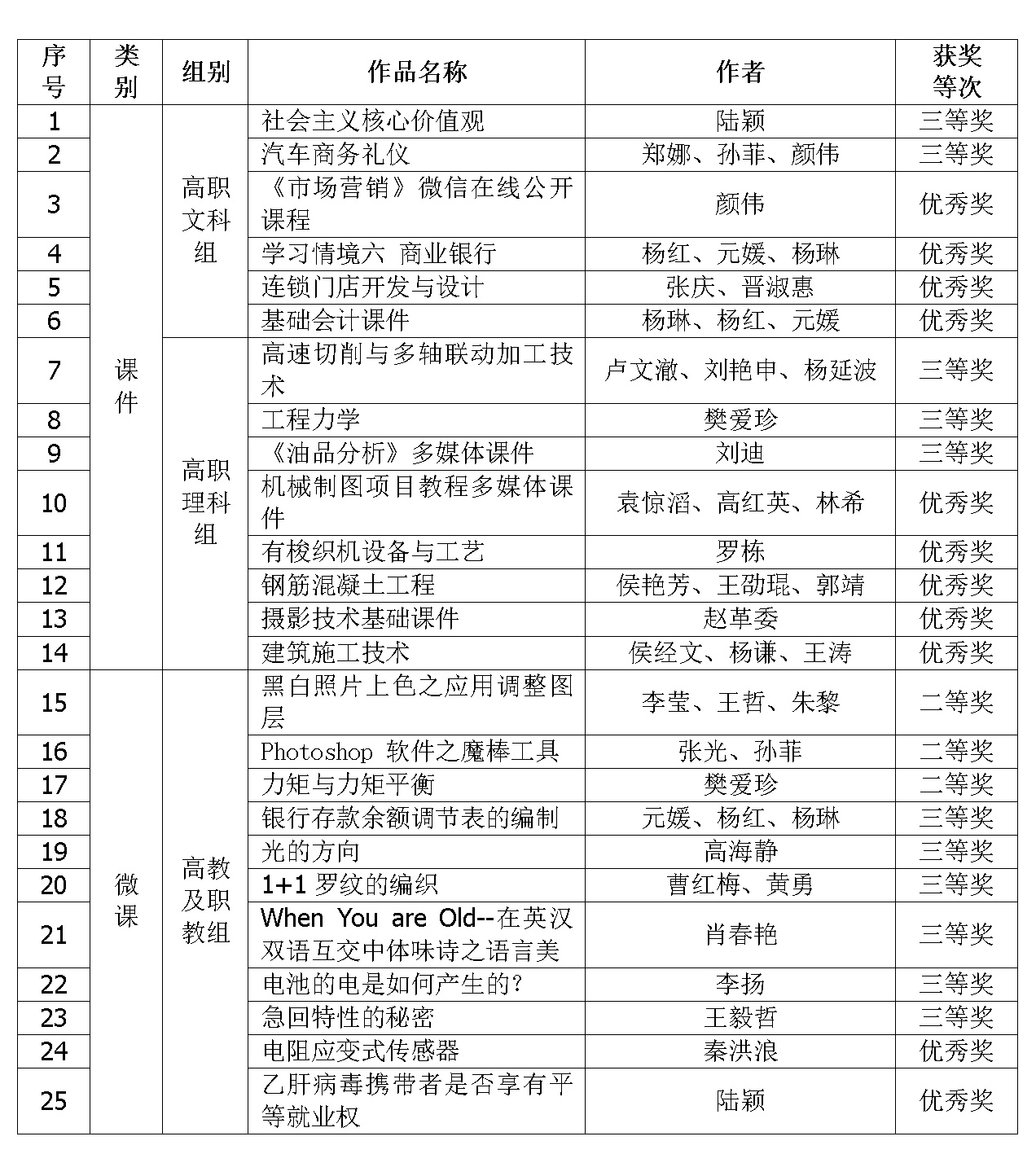 近日,由教育部教育管理信息中心主办的第十五届全国多媒体课件大赛公布获奖名单。我院共有25件作品获奖,其中二等奖3项,三等奖11项,优秀奖11项。我院获最佳组织奖,教务处磨莉同志获大赛先进工作者。