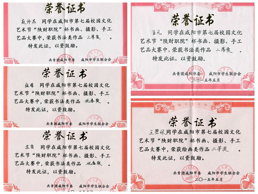 近日,咸阳市第七届大学生文化艺术节暨“陕财职院”杯书画摄影和手工艺品大赛在陕西财经职业技术学院举行,全市10所大中专院校1000多名大学生600余幅作品参展。我院选送多幅作品参赛,最终,王翌琛同学的《写意牡丹》获得书画组二等奖,白凡同学的《行书》、赵帅杰同学的《隶书》、左芮同学的《隶书》、张哲同学的《楷书》分别获书法组二等奖、三等奖、优秀奖。