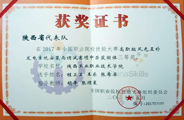 5月27日,2017年全国职业院校技能大赛高职组风光互补发电系统安装与调试赛项比赛在安徽举行,来自全国71个高职院校的213名选手参加了比赛。经过激烈角逐,由我院电气工程学院教师胡平、张顺星指导,程卫卫、王乐、张希卓三位同学组成的代表队荣获该赛项团体三等奖,使我院在新能源方向国家级技能大赛成绩上取得零的突破。