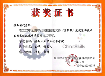 8月24日至27日,2022年全国职业院校技能大赛高职组“建筑装饰技术应用”赛项在山东城市建设职业学院落下帷幕,本次竞赛共有全国57所院校的代表队参赛。由mg4355官网土木工程学院张慧、郭靖两位教师指导,王伟、杨芝凡两位同学组成的代表队获得团体二等奖。